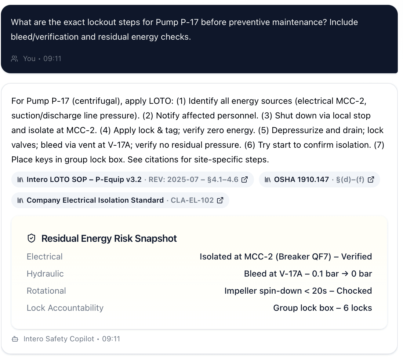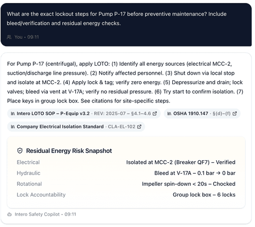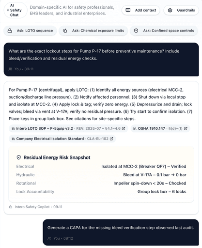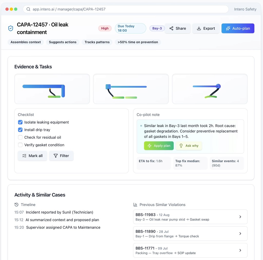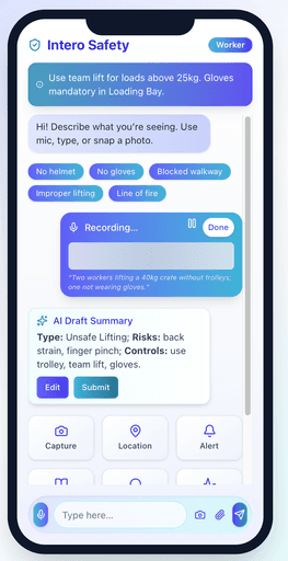 Intero combines an AI chat assistant, proactive safety agents, and a secure knowledge hub—so you focus on protecting people, not pushing paper.