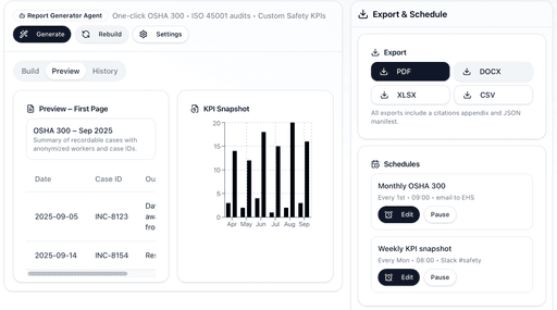 Auto-compile OSHA 300 logs, ISO audit reports, and custom safety management reports with one click.