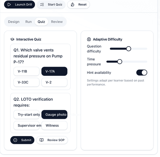Interactive, scenario-based safety drills tailored to your facility and personnel.