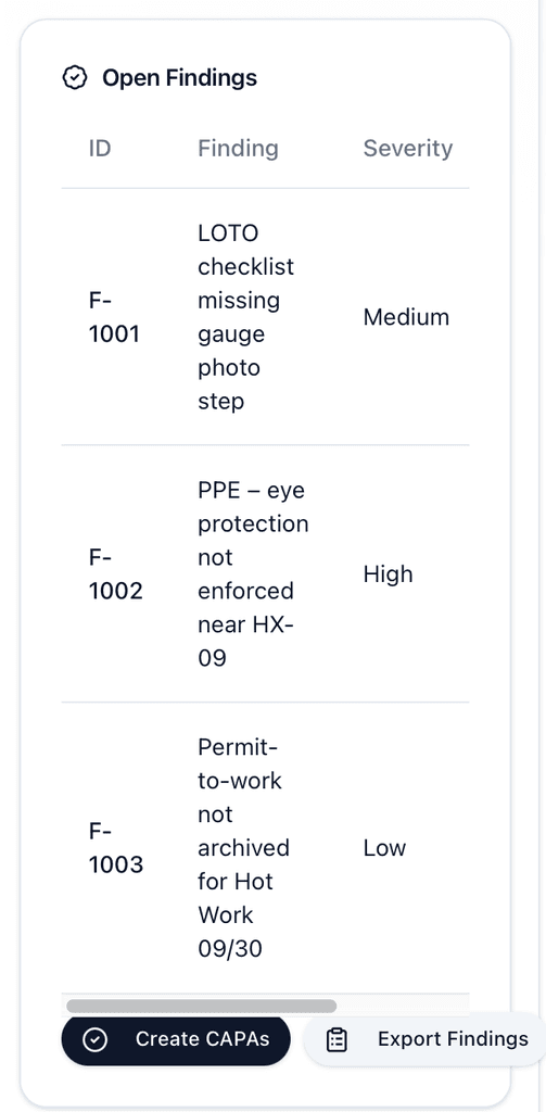 Upload reports and photos to receive instant root-cause analysis and CAPA recommendations.