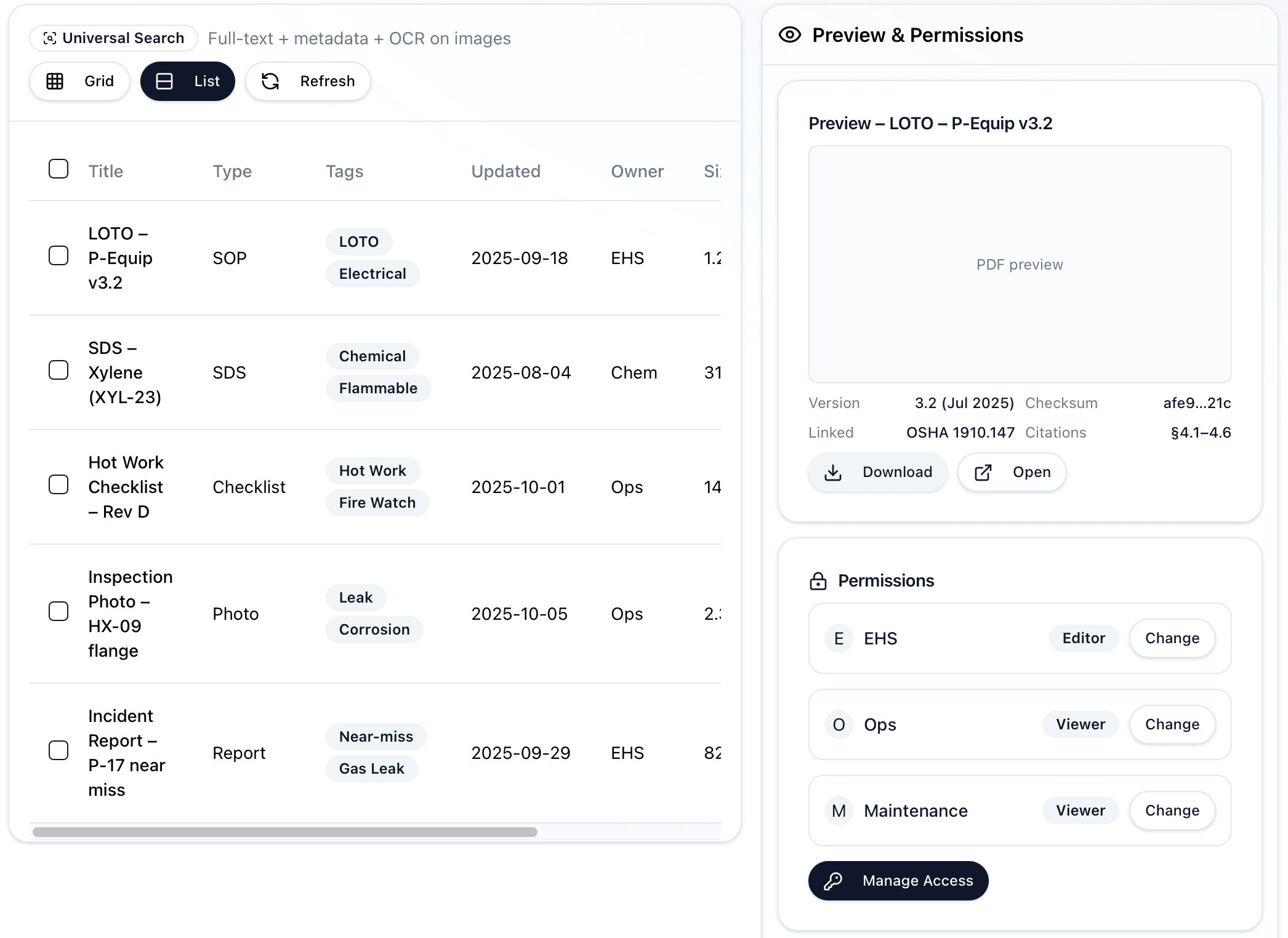 Run proactive audits against OSHA, EPA, ISO 45001, NEBOSH, etc.